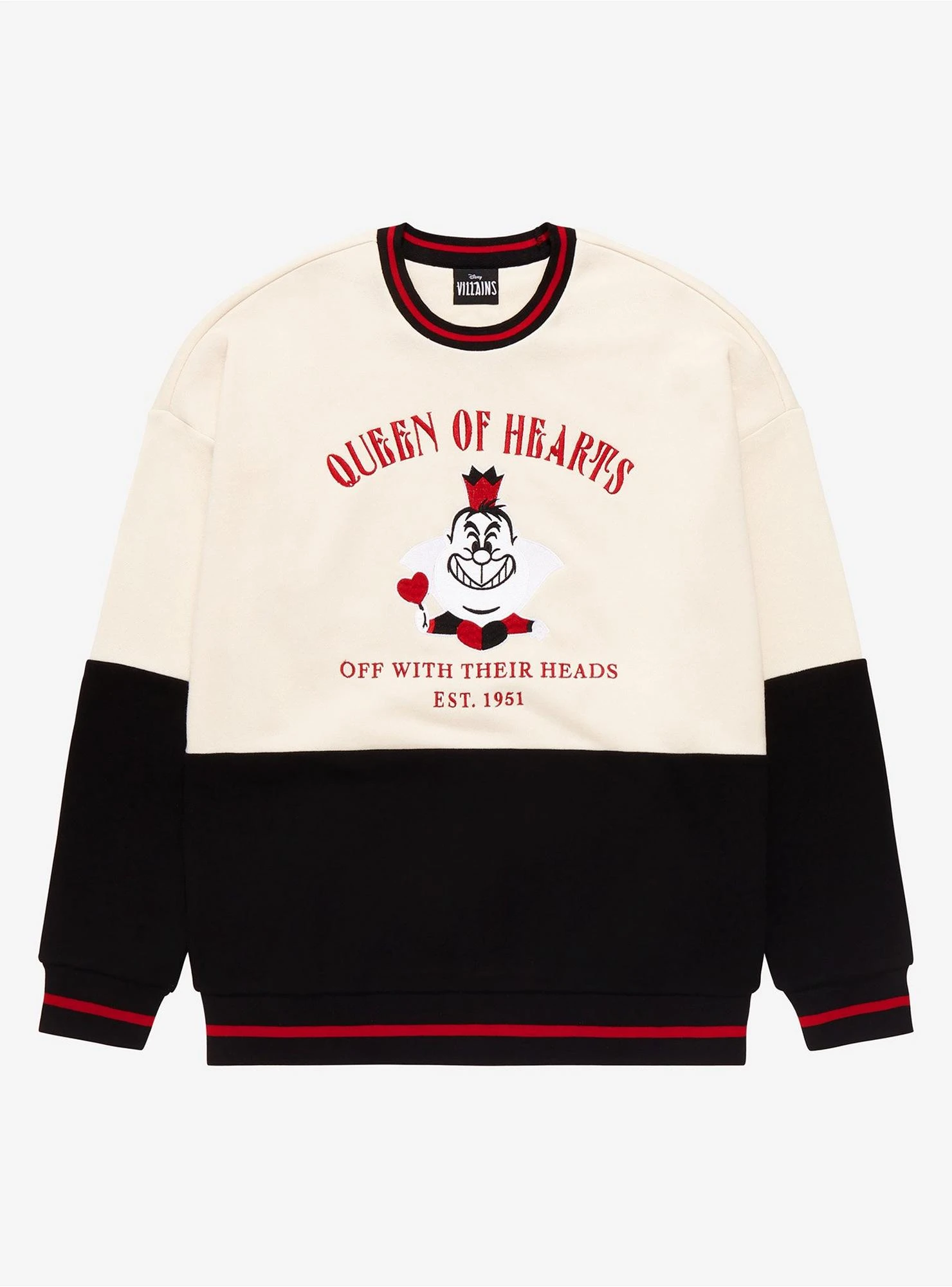 The Queen of Hearts is ready to bring a royal touch to your outfits with this Disney panel crewneck! Inspired by the iconic Disney Villain from Alice in Wonderland, this sweater features a front graphic of the Queen of Hearts with black panel and red striped hem accenting to match the Queen’s favorite colors. Also features embroidered “Queen of Hearts” and “Off With Their Heads Est. 1951” lettering.