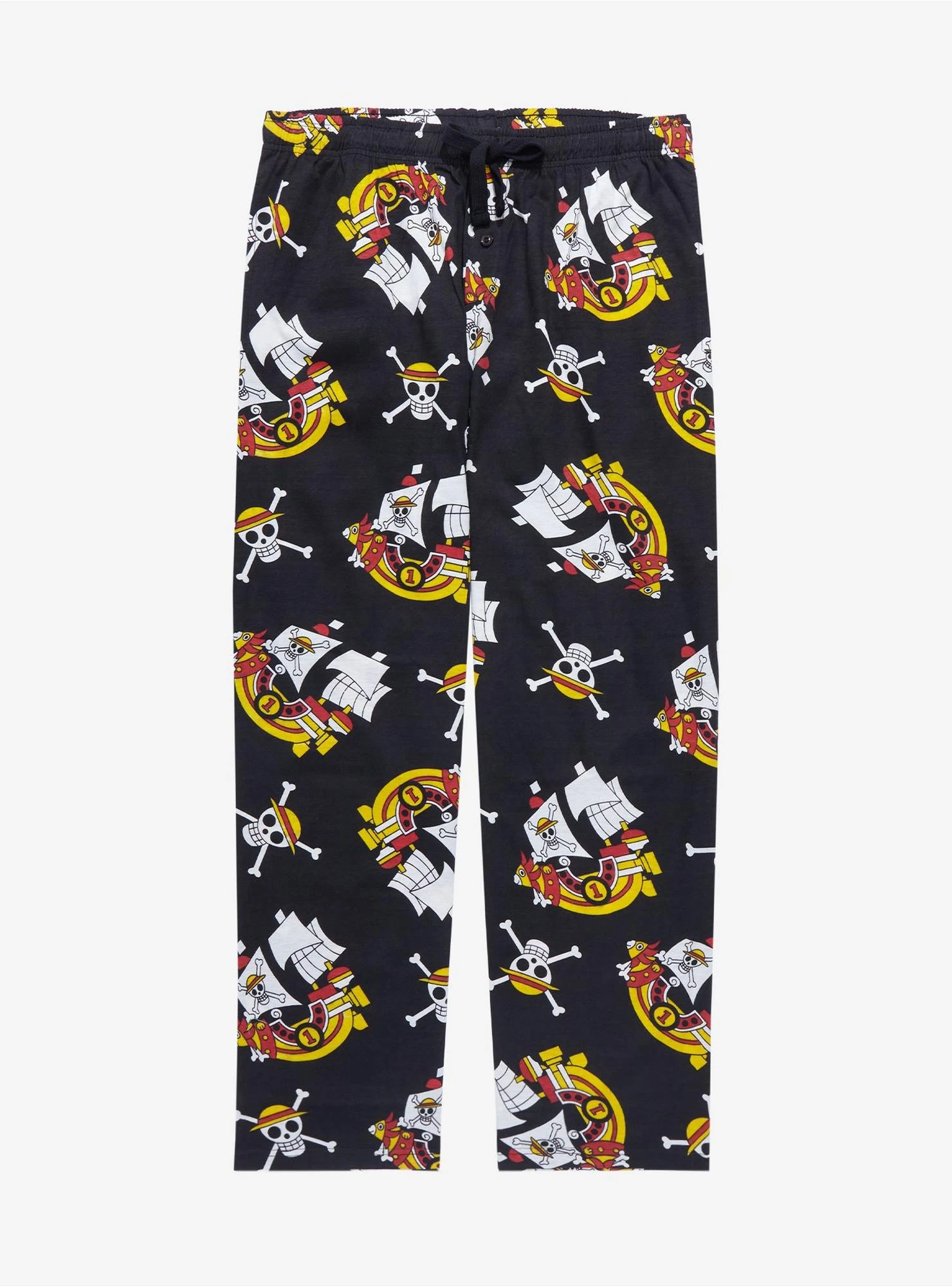 All aboard the Thousand Sunny! Sail the seas to your next nap with the Straw Hat Crew and these One Piece sleep pants! With an allover print featuring the Thousand Sunny ship and Monkey D. Luffy’s jolly roger, these sleep pants are the perfect addition to your next anime marathon. Also features drawstring elastic waist, button fly, and side pockets.