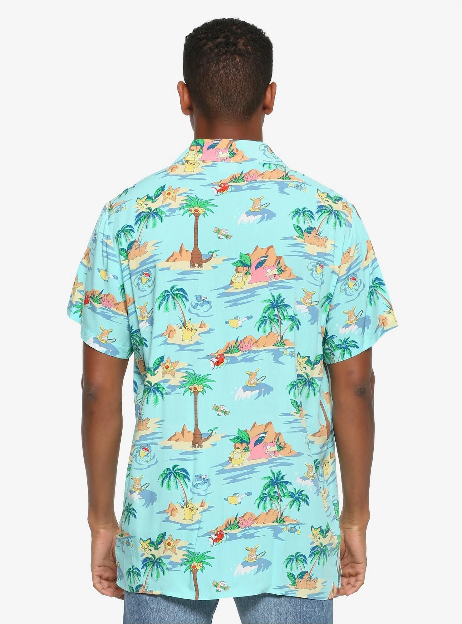 Being stuck in a Poké Ball all day calls for a tropical vacay. This lightweight button-up shirt features an allover print of several Pokémon gettin’ in their Vitamin D! Features a left chest pocket and faux wood buttons.