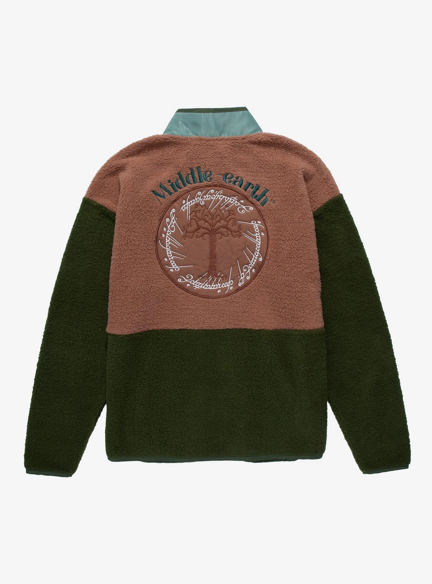 Warm up on your way to the Shire with this ultra-comfy sherpa sweater! Inspired by the fantasy epic The Lord of the Rings, this sweater features a color block design, perfect for bringing some Middle-earth style to your next adventure with your Fellowship. Also features the tree of Gondor as the embroidered decoration on the back.